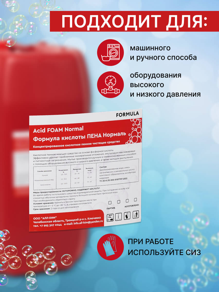 Кислотное пенное моющее средство для удаления сильных минеральных отложений Кислотное пенное моющее средство предназначено для обработки внешних и внутренних поверхностей технологического оборудования с целью удаления стойких минеральных отложений (водных, молочных, пивных, винных и иных минерал образованных отложений) с любых твердых поверхностей из кислотостойких материалов (нержавеющая сталь, черный металл, керамика, пластмасса и т. п.). Средство обладает смачивающим, очищающим, эмульгирующим действием. Средство подходит для обработки FOAM системах различного типа, предназначено для мытья пеногенератором (пенной станцией) и ручным способом.
